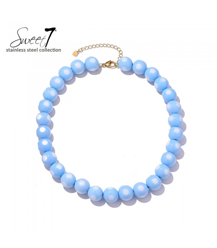 Hemelsblauw en helemaal on trend. Waarom kiezen tussen speels en stijlvol als je beide kunt hebben? Deze halsketting uit de Sweet7 is de kleur boost die je look doet opleven. De grote, glanzende kralen in helder babyblauw brengen direct frisheid en flair. Een eyecatcher die doet denken aan zomerhemels perfect voor wie durft te stralen met kleur.