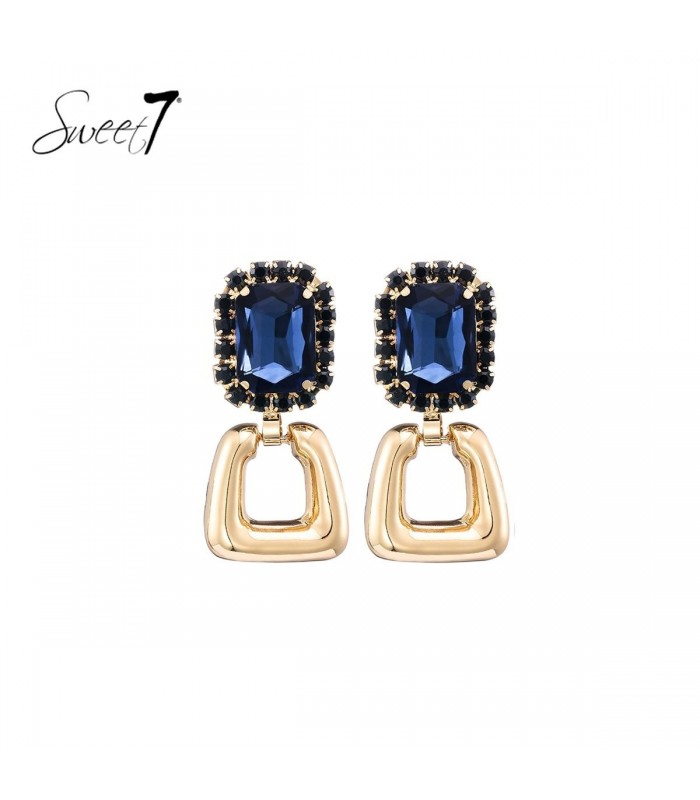 Hoe voeg je een luxe toe aan je look? Deze oorbellen van Sweet7 combineren een diepblauwe rechthoekige steen met fonkelende rand en een elegante goudkleurige hanger. Het contrast tussen de glanzende steen en de metalen vorm maakt ze stijlvol en opvallend tegelijk.