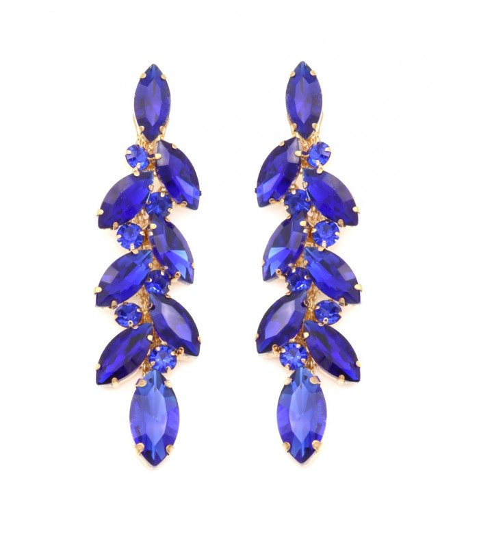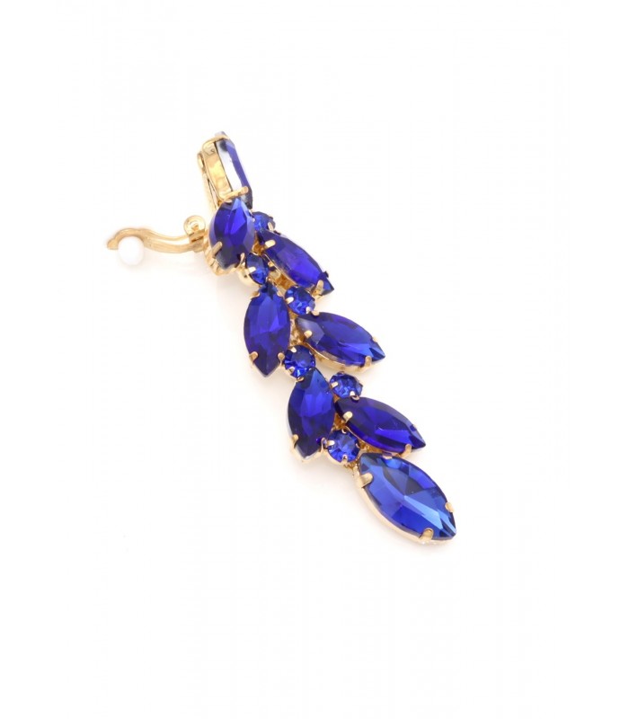 Prachtige blauwe lange oorclips met glas steentjes in goudkleurige setting