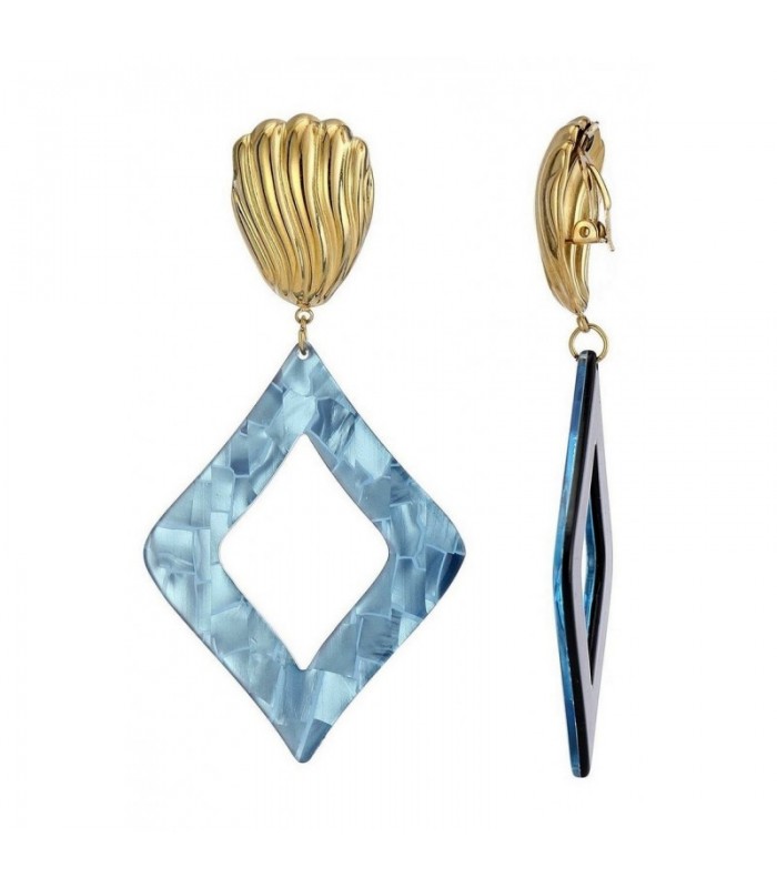 Wil je kleur toevoegen zonder te overdrijven? Deze oorclip combineert een goudkleurige clip met een lichtblauwe ruitvormige hanger. De gemarmerde structuur in het kunststof vangt het licht en geeft elke outfit een moderne. Comfort ontmoet stijl Dankzij de zachte rubbertjes zit de clip stevig zonder te knellen. Een perfecte balans tussen comfort en fashion flair voor elke gelegenheid