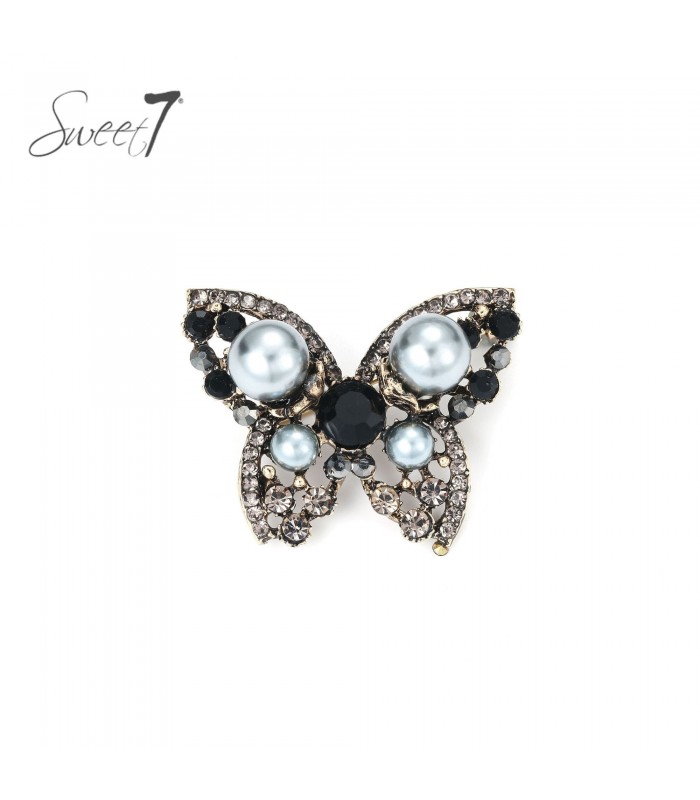 Mag jouw outfit wat extra glamour gebruiken? Deze vlinderbroche met parels en kristallen combineert romantiek met klasse. De zwarte accenten zorgen voor contrast, terwijl de parels zacht glanzen op elk jasje of sjaaltje. Chique details in vintage stijl Met zijn antiek goudkleurige basis en mix van fonkelende steentjes oogt deze broche als een erfstuk met moderne flair. Perfect als eyecatcher op een blazer of jurk. Een tijdloos accessoire dat jouw stijl versterkt..