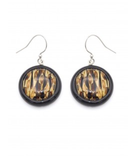 Wil je oorbellen die meteen de aandacht trekken? Deze ronde oorbellen combineren een opvallend dierenprint-achtig design in warme bruintinten met een glanzende zwarte omlijsting. Ze geven je look een stoere en modieuze touch. Trendy en veelzijdig Dankzij hun natuurlijke kleuren zijn deze oorbellen eenvoudig te combineren met zowel casual als chique outfits. Licht van gewicht en voorzien van een comfortabele haaksluiting voor dagelijks draagplezier.
