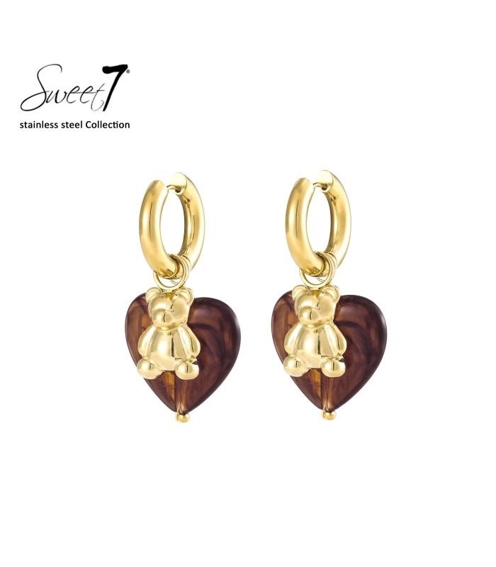 Op zoek naar oorbellen die fun en fashion combineren? Deze goudkleurige oorbellen uit de stainless steel collectie zijn versierd met een schattige teddybeer die sierlijk rust op een hart van bruin gemarmerd acryl. Een unieke mix van schattig en stijlvol ideaal om je look een vrolijke twist te geven. Trendy en duurzaam design De oorbellen zijn gemaakt van roestvrij staal, waardoor ze lang mooi blijven en comfortabel dragen. De warme bruine tint van het hartje contrasteert perfect met het glanzende goud. Een must have accessoire voor wie graag opvalt met originele details.