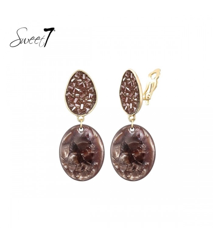 Deze bruine oorclips vormen de perfecte balans tussen natuurlijke tinten en een stijlvolle uitstraling. De ovale hanger heeft een marmerachtige glans, terwijl de bovenkant is bezet met glinsterende glas stukjes. Ideaal voor wie op zoek is naar fashion oorbellen met een warme, elegante touch. Comfort zonder gaatjes Dankzij de zachte rubbertjes blijven deze oorclips stevig en comfortabel zitten. De goudkleurige afwerking maakt ze makkelijk te combineren met andere sieraden. Een subtiele statement voor elke dag of een casual avondje uit.