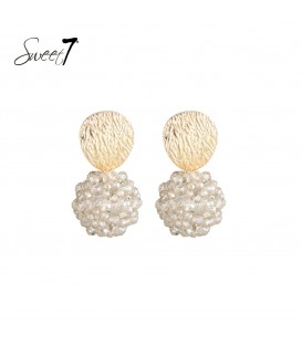 Oorbellen beige met goudkleurige structuur en sprankelende kralenbol.