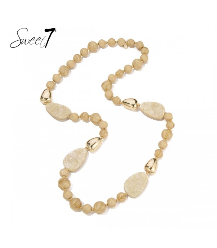 Op zoek naar een ketting die moeiteloos elke outfit versterkt? Deze halsketting in warme beige tinten combineert glanzende kralen met grove natuursteen-look elementen en goudkleurige accenten. De zachte kleuren en organische vormen geven een natuurlijke luxe uitstraling. Halsketting met speelse vormenmix De afwisseling van ronde kralen, glanzende metalen details en mat gemarmerde steenvormen zorgt voor een modern, maar tijdloos ontwerp. Deze ketting sluit perfect aan bij populaire zoektermen als statement ketting en lange kralenketting.