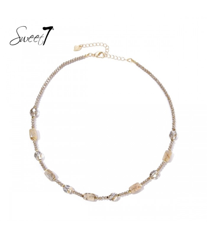 Wil je een halsketting die verfijnd en opvallend is? Deze stijlvolle ketting van Sweet7 mixt transparante facetkralen met beige natuursteenaccenten. De combinatie van neutrale tinten en glanzende details maakt dit sieraad een subtiele blikvanger, perfect voor zowel casual als chique gelegenheden. Verstelbaar en makkelijk te combineren De halsketting is licht van gewicht en heeft een verstelbare sluiting voor optimaal draagcomfort. Ideaal als los sieraad of als onderdeel van een meerdere halskettingen. Onmisbaar in de sieradencollectie van elke fashionliefhebber die houdt van zachte kleuren en moderne eenvoud.
