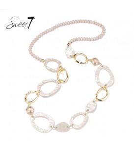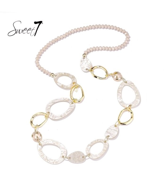 Hoe straal je elegantie uit zonder te overdrijven? Deze lange halsketting van Sweet7 bewijst dat absoluut. De zachte, beige schakels in organische vormen worden afgewisseld met subtiele goudkleurige accenten en neutrale facetkralen. Het resultaat is een verfijnde ketting die licht en beweging toevoegt aan elke look, zonder te overheersen. De lengte van de halsketting is 98 cm