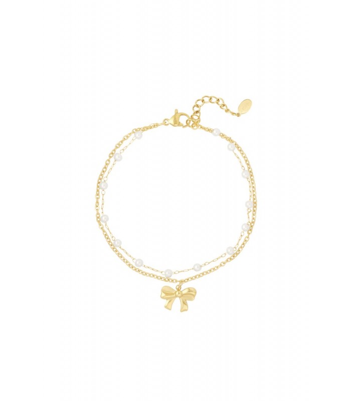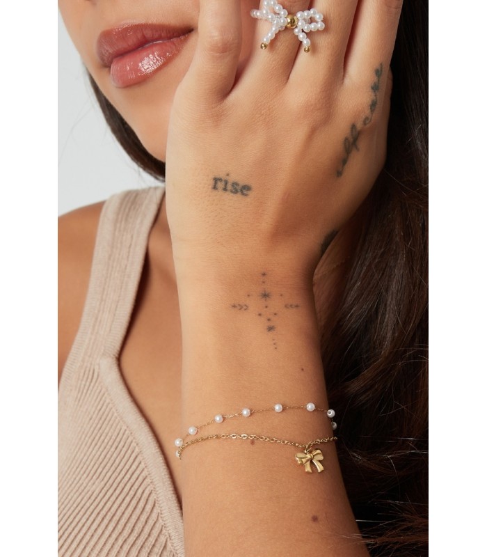 Goudkleurige dubbele armband met imitatie parel en een strik als bedel.