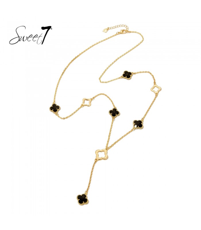 Mag een halsketting verfijnd en opvallend zijn? Deze goudkleurige ketting met klavervormige elementen bewijst dat perfect. De combinatie van zwarte klavertjes zorgt voor een chique uitstraling met een subtiel speels effect. Ideaal voor dagelijks gebruik of een stijlvolle avondlook. Licht, verfijnd en veelzijdig De fijne schakels en symmetrisch geplaatste details geven deze halsketting een elegante flow. De zwarte accenten vormen een sterk contrast met het glanzende goud, wat zorgt voor een moderne, luxueuze look. Perfect te combineren met een open halslijn of als laagjesketting.