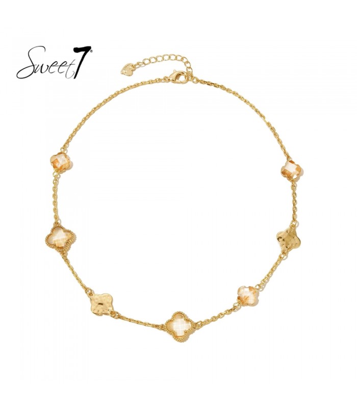 Goudkleurige luxe in speelse vormen. Op zoek naar een halsketting die elegantie en glamour combineert? Deze goudkleurige ketting van Sweet7 speelt met vormen en materialen. De schakels wisselen af met glanzende kristallen accenten, waardoor een luchtige maar luxe uitstraling ontstaat. Perfect voor zowel feestelijke gelegenheden als een chique overdag outfit. Verfijnd design met comfortabele pasvorm De ketting is licht, soepel en verstelbaar in lengte, zodat hij mooi op de hals valt. Draag hem solo voor een subtiel sieraad effect of combineer met andere gouden kettingen. Een gouden statement met tijdloze allure.
