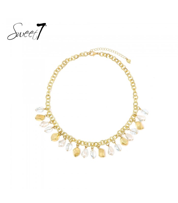 Speelse glans in een gouden jasje. Op zoek naar een halsketting die elke outfit net dat beetje extra geeft? Deze ketting combineert een stevige goudkleurige schakel met transparante en parelachtige hangers. Het contrast tussen structuur en glans zorgt voor een moderne en stijlvolle twist. Perfecte balans tussen stoer en vrouwelijk De combinatie van schakels met fijne druppelvormige details maakt deze halsketting veelzijdig. Draag hem op een effen blouse of boven een strapless jurk de ketting trekt subtiel de aandacht en benadrukt je neckline.