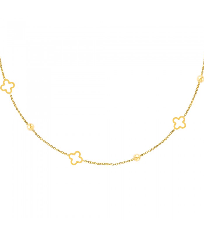 Goudkleurige halsketting met kleine open klavertjes. Heb je een feestje, een bruiloft of wil je gewoon jezelf verwennen? Yehwang is een modern, hip en eigentijds sieraden merk. Veel glitter, zilver en goud met vaak een uitstekende afwerking zoals gold plating of Rhodium en gemaakt van roestvast staal. Hierdoor krijgen de armbanden niet alleen een hippe uitstraling, maar zijn ze ook gemaakt van kwalitatief, hoogwaardig materiaal. De halsketting is nikkelvrij.