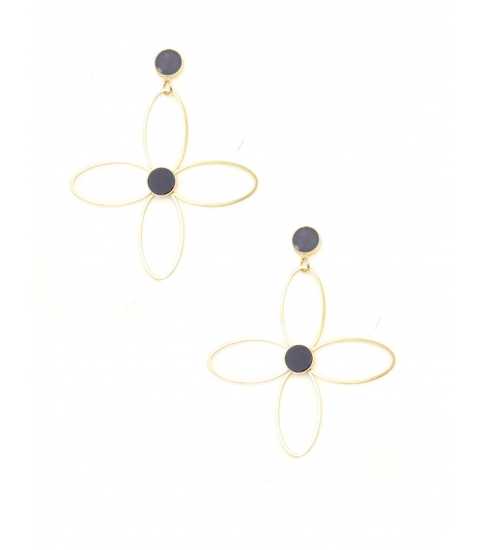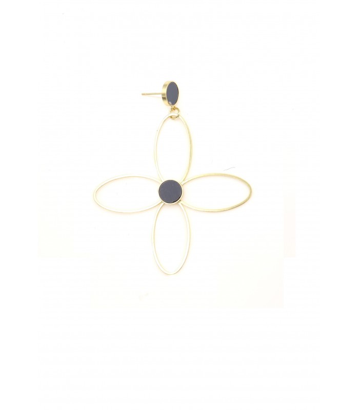 Hoe combineer je minimalistisch design met een speelse twist? Deze oorbel in abstracte bloemvorm doet precies dat. De goudkleurige lijnen vormen een luchtige vierbloem, geaccentueerd met zwarte ronde details. Lichtgewicht, maar groots in uitstraling de blikvanger voor je outfit. Fashionstatement met finesse Deze oorbellen geven elke look een artistieke uitstraling. Het contrast tussen het zwarte en het goudkleurige metaal zorgt voor een elegante balans. Ideaal voor fashionistaas die houden van unieke vormen.