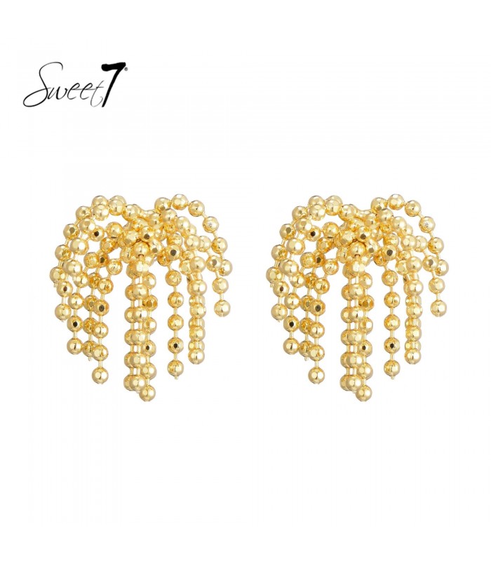 Hoe geef je een simpele outfit in een keer een glam boost? Met deze opvallende oorbellen van Sweet7. De gouden kralen vallen in speelse strengen naar beneden en vangen elk lichtstraaltje. Perfect voor feestjes, diners of een avondje uit. Statement oorbellen zoals deze combineren moeiteloos met zowel casual als chique looks. Trendy en tijdloos De ronde kralen in goudkleur geven deze oorbel een tijdloze, maar trendy uitstraling. Door het volume en de beweging trekken ze de aandacht zonder te overheersen. Dit accessoire is een echte musthave voor wie houdt van glamour met een knipoog. Voeg dit glanzende paar toe aan je sieradencollectie en maak elke look compleet.