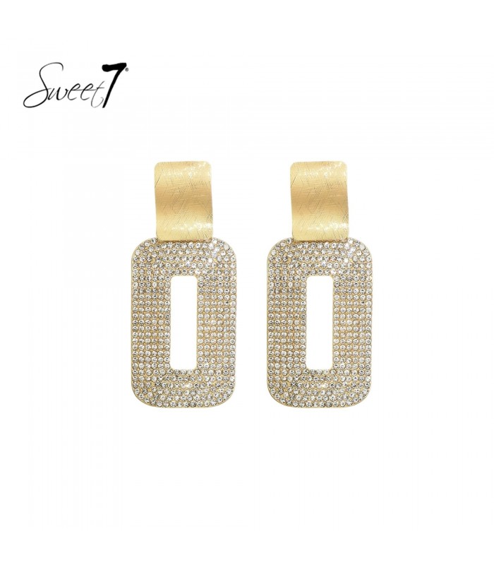 Hoe voeg je glamour toe aan je look in een beweging? Deze rechthoekige oorbellen van Sweet7 doen precies dat. De goudkleurige basis is rijkelijk bezet met fonkelende strass steentjes, waardoor je meteen een feestelijke uitstraling krijgt. Perfect voor avondlooks of als opvallend accent bij een basic outfit.