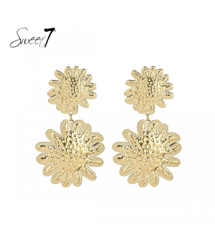 Ben je op zoek naar een opvallende oorbel die direct karakter aan je look toevoegt? Deze dubbele oorbel van Sweet7 in bloemvorm combineert organische vormen met een gehamerd afwerking. De goudkleur geeft een luxueus accent, perfect voor een fashion forward uitstraling. Vol volume, comfortabel Ondanks het royale design zijn deze oorbellen comfortabel om te dragen. De structuur geeft een speelse twist aan minimalistische outfits en versterkt feestelijke looks. Onmisbaar voor wie houdt van grote oorbellen met een artistieke touch.