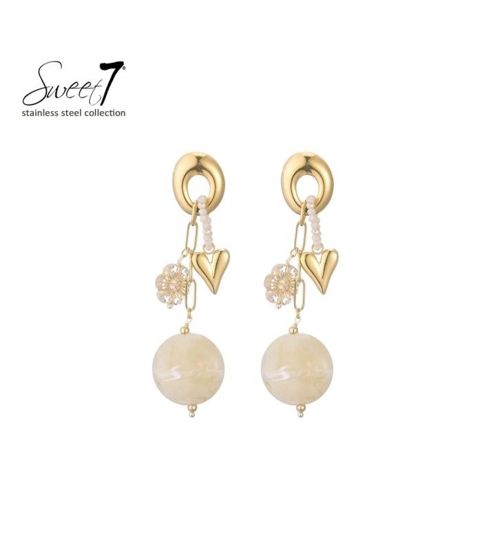 Oorbellen met zachte luxe. Wil je een oorbel die romantiek en klasse uitstraalt? Deze oorbellen combineren een goudkleurige schakel met een harten bedel en subtiele kralen. De grote marmerlook kraal geeft body en beweging. Perfect als stainless steel oorbellen voor een elegante, trendy look.
