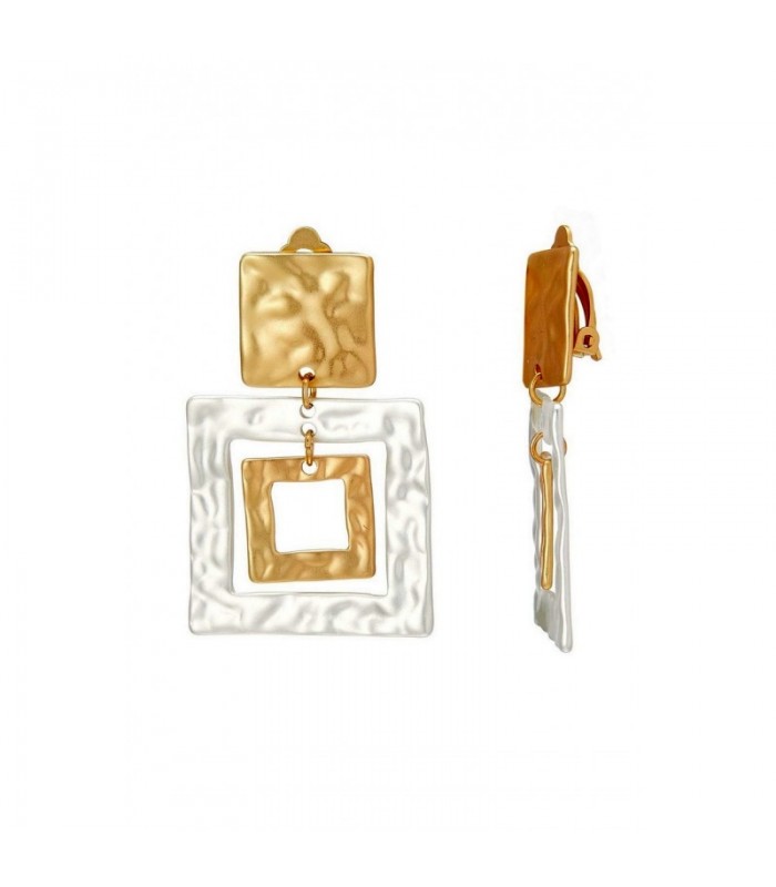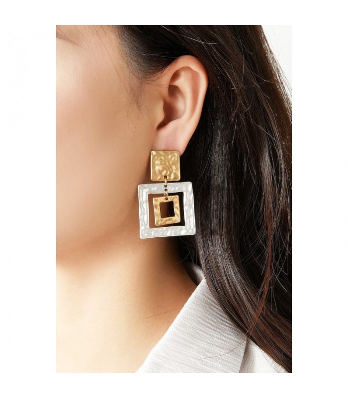 Zoek je een oorbel die direct in het oog springt? Deze oorclips combineren goudkleurige en zilverkleurige vierkanten in een speels, gelaagd design. De gehamerde textuur geeft de strakke vormen een levendige, bijna artisanale uitstraling, perfect voor wie houdt van karakter in haar sieraden. Ideaal voor een avond uit of om een basic outfit te transformeren tot iets bijzonders.