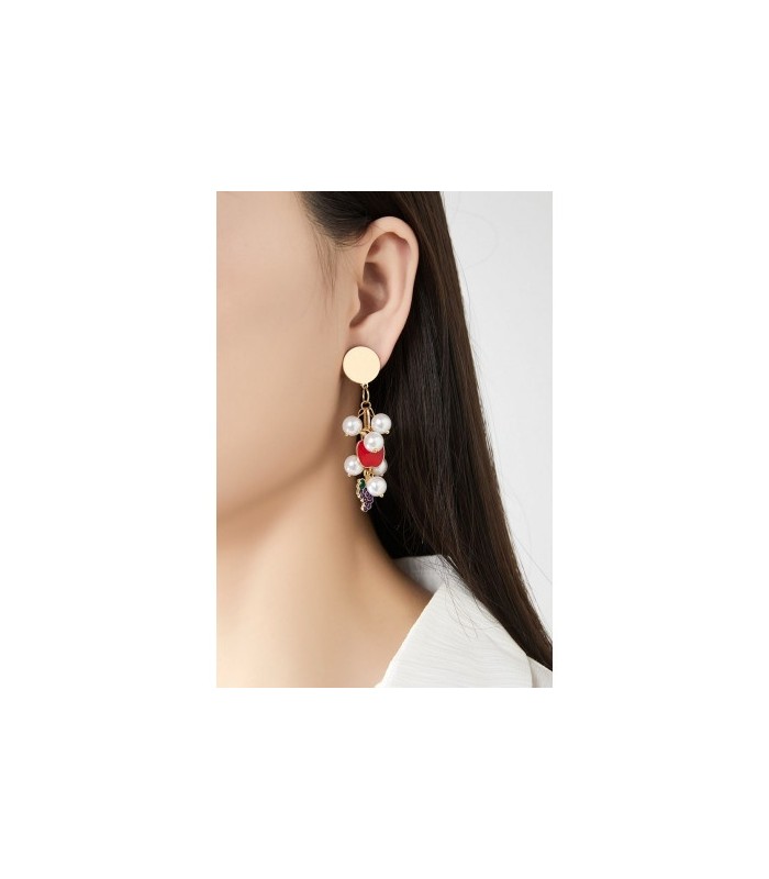 Speels fruitaccent met parelglans. Hoe combineer je fun met elegantie? Deze oorclips doen het met gemak dankzij de combinatie van witte parels, een rode appel en paarse druiven. De fruit bedels zorgen voor een vrolijk accent, terwijl de parels het geheel een verfijnde look geven. Ideaal voor wie durft te mixen.
