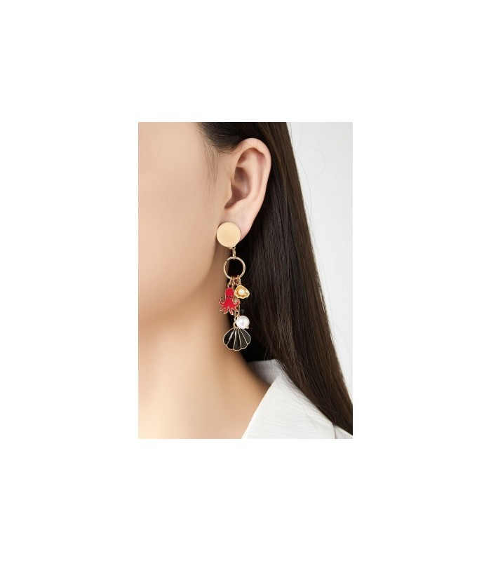 oe geef je je look een vrolijke, maritieme vstijl? Deze goudkleurige oorclips zijn versierd met een rode octopus, zwarte schelp, parels en kralen. De combinatie van zee thema en opvallende bedels maakt dit een unieke toevoeging aan elke outfit.