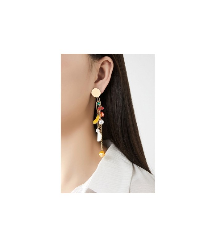Hoe breng je kleur in je outfit met een accessoire? Deze speelse oorclips combineren gouden accenten met vrolijke fruit bedels zoals banaan, kers en watermeloen. De glanzende parels en felgekleurde kralen zorgen voor een opvallende touch. Gedurfd en comfortabel design De verschillende hangertjes geven de oorclips een unieke, bewegende uitstraling. Dit is het sieraad voor wie houdt van fashion oorbellen met karakter.