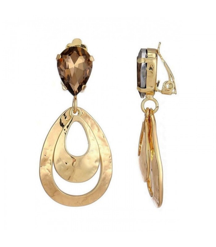 Hoe trek je moeiteloos de aandacht? Deze oorclip combineert een druppelvormig facetgeslepen bruin kristal met golvende, goudkleurige lagen. Het contrast tussen glans en structuur geeft deze oorclips een opvallend en stijlvol karakter. Stijlvol zonder oorgaatjes De warme bruintint van het kristal matcht prachtig met het goud en laat zich makkelijk combineren met zowel neutrale als diepe kleuren.