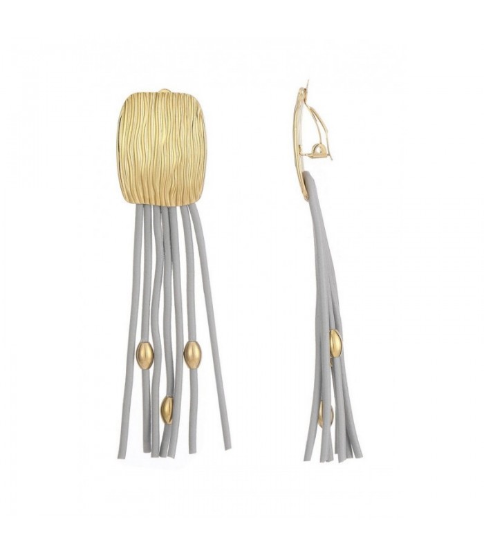 Statement met soepele lijnen. Hoe combineer je structuur met beweging? Deze opvallende oorclips doen het met gemak. De gebogen, geribbelde clip in goudkleur vormt een krachtig basisaccent, terwijl de lange grijze strengen met gouden kralen zorgen voor ritme en elegantie.