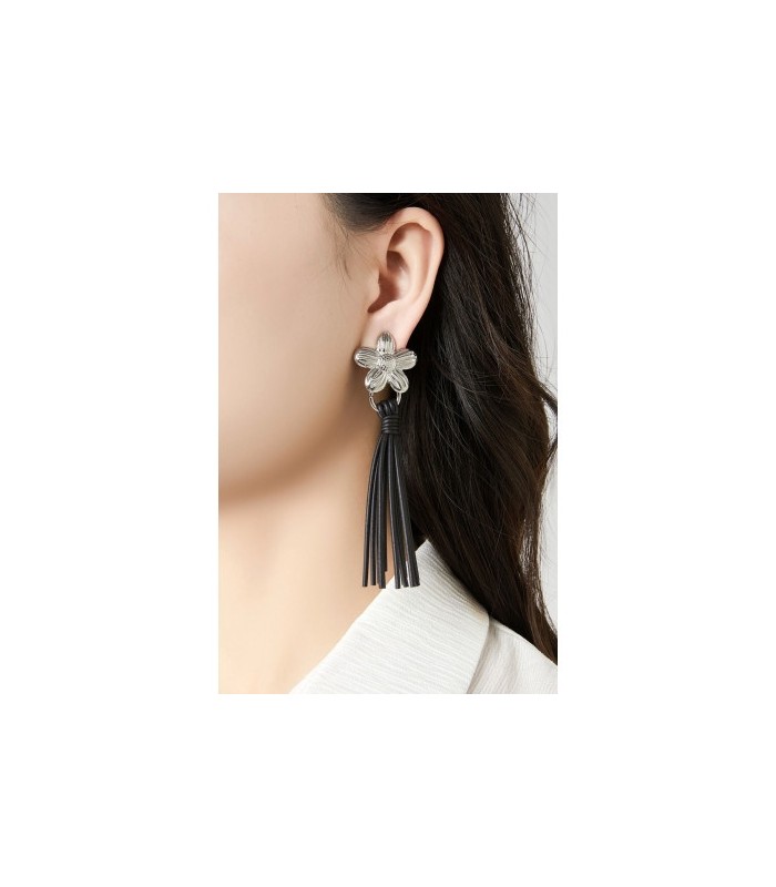 Hoe geef je bloemenkracht? Deze oorclips combineren een goudkleurige bloem met speelse grijze strengen, stijlvol vastgebonden tot een moderne tassel. Het resultaat, een vrouwelijke, maar gedurfde oorbel die opvalt door vorm en materiaal.