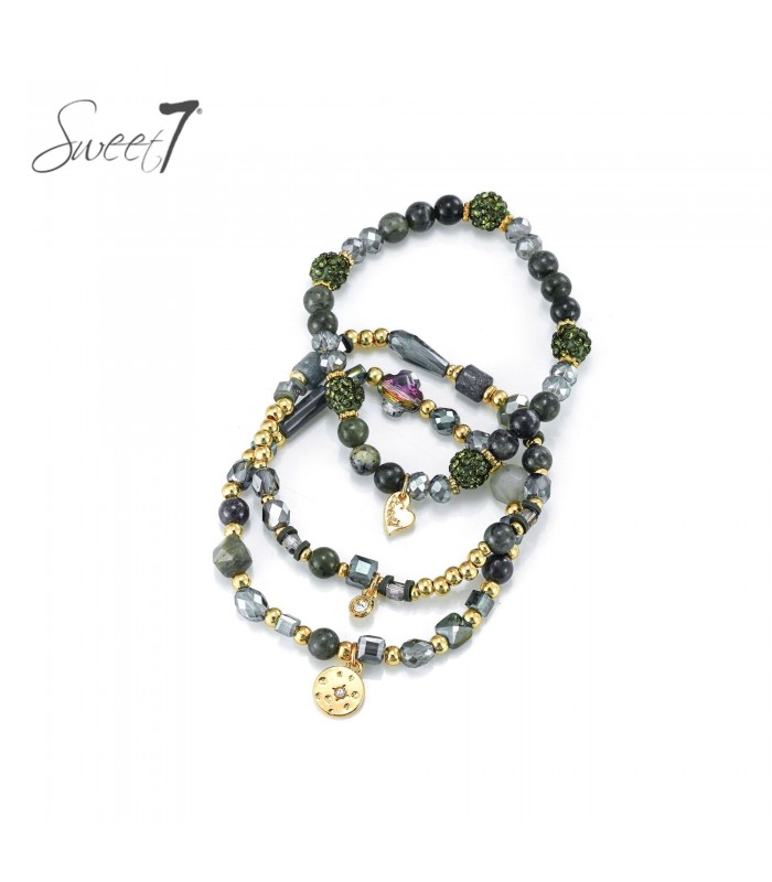 Deze meer laagse armband set doet het moeiteloos. De combinatie van donkergroene, goudkleurige en facetgeslepen kralen geeft elke pols een verfijnde, maar speelse uitstraling. De glanzende accenten zorgen voor een subtiel luxueus effect. Mix van materialen en symboliek Elke armband is uniek in opbouw en verrijkt met kleine bedels zoals hartjes en muntjes. De elastische pasvorm maakt ze comfortabel en geschikt voor elke polsmaat. Deze armband is ideaal om solo te dragen of te combineren met andere armbanden voor een gelaagde, modieuze look die opvalt zonder te overdrijven.