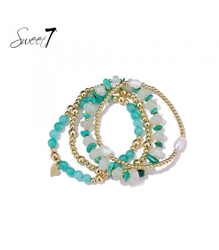 De zachte groene tinten doen denken aan frisse natuur en helder water. Deze kralen armband straalt rust en stijl uit. De goudkleurige accenten geven de armband een trendy glans die perfect past bij een moderne fashion look.