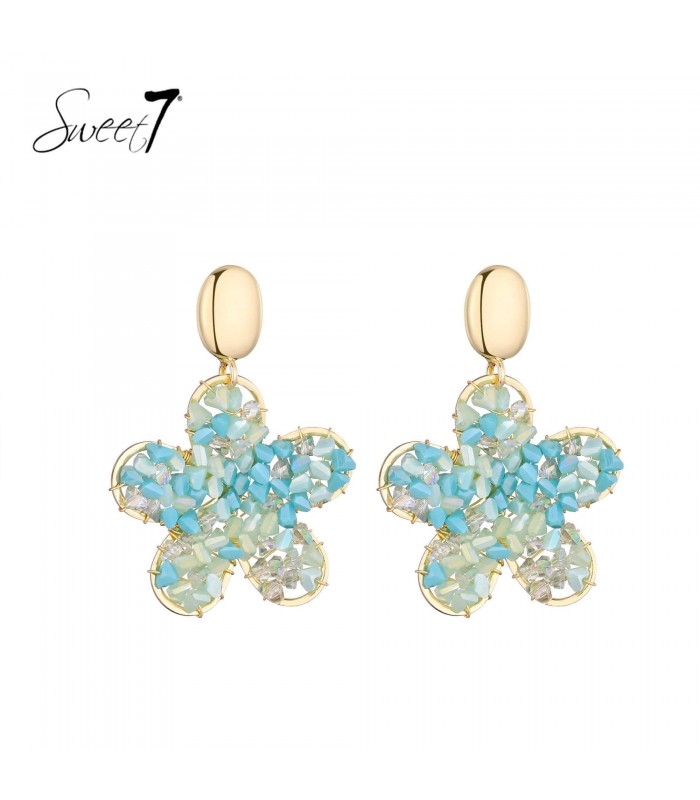 Bloemenpracht in ijsblauwe tinten Hoe breng je het frisse gevoel van een lentedag naar je look? Deze speelse oorbellen van Sweet7 vangen dat gevoel perfect. De bloemvorm is opgebouwd uit een mix van turquoise, opaalwit en transparante steentjes, die samen een sprankelend geheel vormen. Licht, vrolijk en onweerstaanbaar charmant.