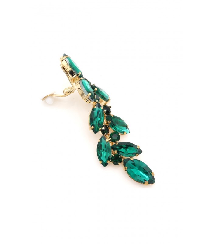 Hoe trek je moeiteloos alle aandacht? Deze oorclips stralen luxe uit met groene stenen in een elegante bladvorm. De gouden zetting versterkt de diepe kleur en maakt dit ontwerp perfect voor feestelijke looks of een chique diner-outfit. Comfort zonder compromis De clip on sluiting zit stevig en comfortabel, zelfs zonder gaatjes. Door het design draag je deze fashion oorbellen met gemak. Ideaal voor wie wil opvallen met klasse en zonder concessies.