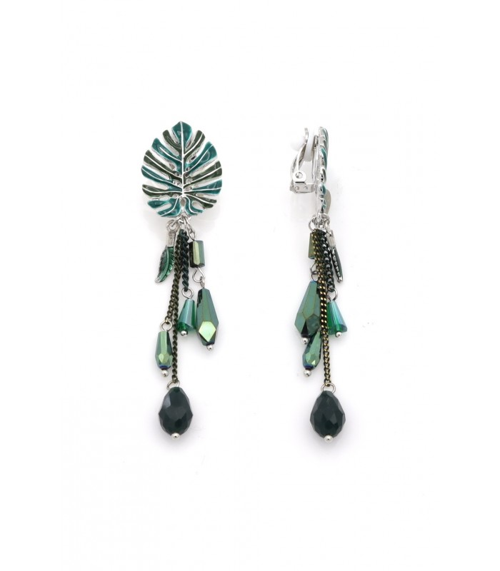 Oorclips met groen blad en kristal hangers aan een kettinkje