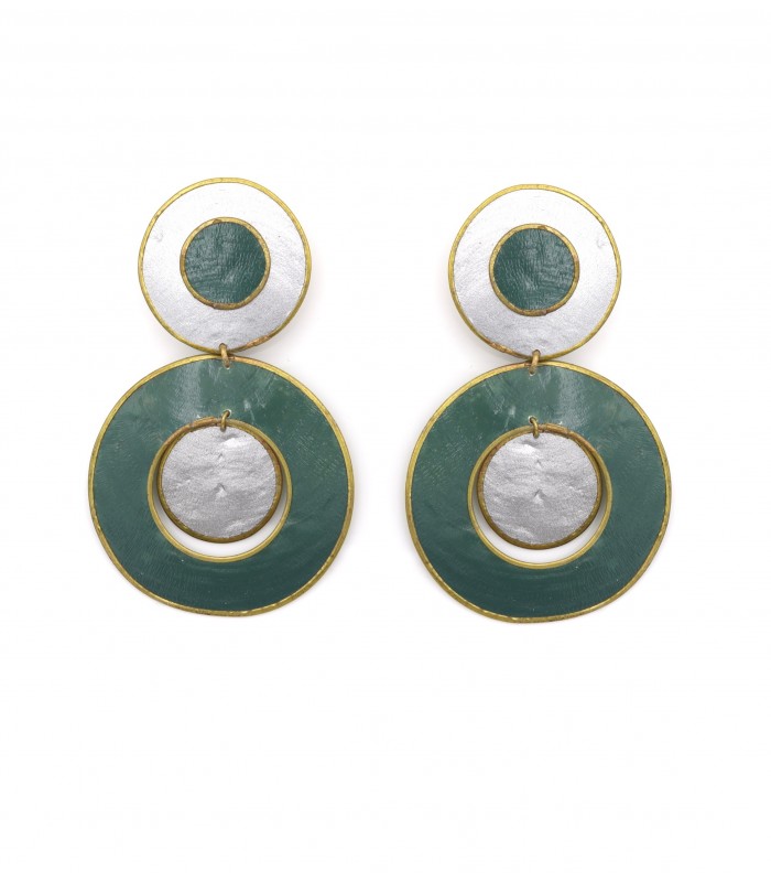 Deze oorclips combineren donkergroen en zilver in een opvallend cirkelontwerp met gouden accenten. De dubbele schijven creeren een speels 70s effect dat direct de aandacht trekt. Ideaal voor wie houdt van vintage flair met een moderne twist. Perfect voor feest, festival of fashion statement.