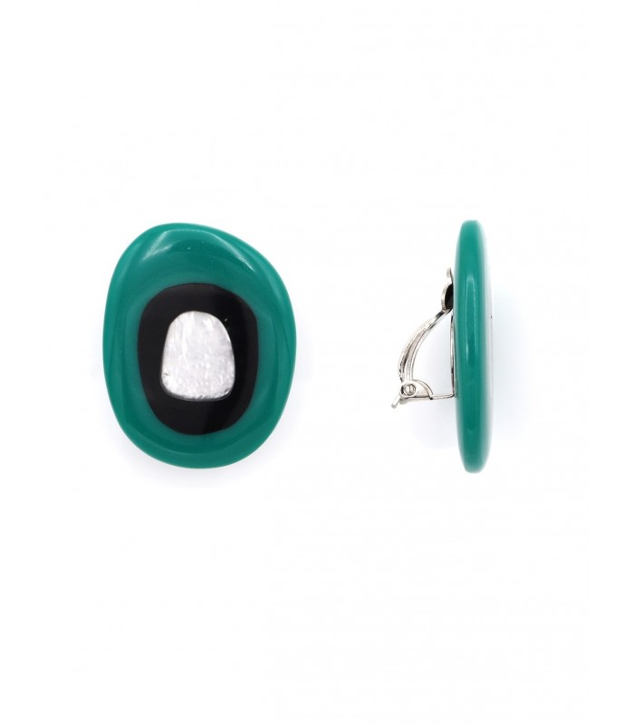 Hoe geef je jouw outfit direct een grafische boost? Deze oorclips combineren groen met zwart en een glanzend zilverkleurig accent in een abstract ovaal design. Ideaal voor liefhebbers van statement oorclips en vintage geinspireerde sieraden. Opvallend en comfortabel De gelaagde kleurcombinatie zorgt voor diepte en contrast. Perfect bij een monochrome outfit of als kleuraccent.