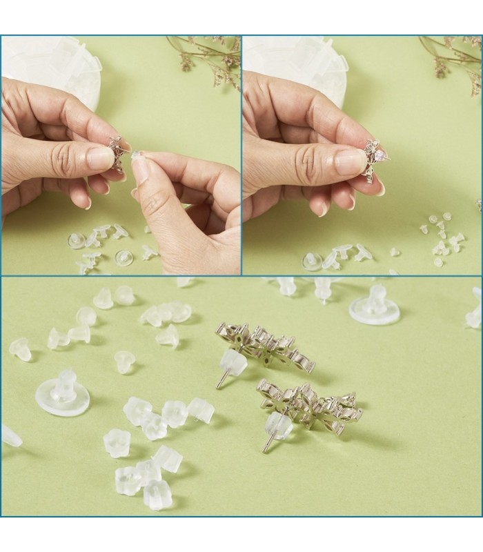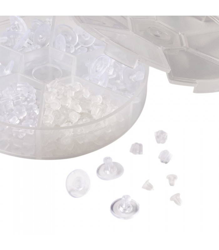 Doosje met drie soorten oorbellen rubbertjes, geschikt voor zowel oorhangers (haakje) als ook oorstekers. Inhoud van het handig hersluitbaar doosje is circa: Oorbelrubbertje, stoppertjes: 4x3.5x3.5mm, gat: 0.7mm, 170 stuks Oorbelrubbertje, stoppertjes: 6x10mm, gat: 0.5mm, 80 stuks Oorbelrubbertje, stoppertjes: 4x2.5mm, gat: 0.7mm, 90 stuks.