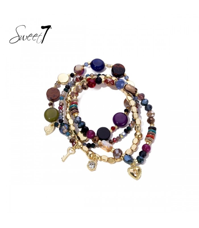 Kleurexplosie met goudkleurige bedels. Hoe voeg je direct karakter toe aan je outfit? Deze armbanden set met een mix van diepe kleuren en gouden kralen is het antwoord. Elke armband is uniek samengesteld met glanzende kralen, kleurrijke accenten en speelse bedels. Een opvallend fashion statement voor elke stijl. Boho gevoel & betekenisvolle bedels Van paars tot rood en van groen tot blauw de kleuren zorgen voor een bohemian look met luxe flair. De hart, sleutel en kristal bedels maken de set symbolisch en stijlvol. Combineer met basic kleding of versterk je festival look met deze opvallende accessoire.