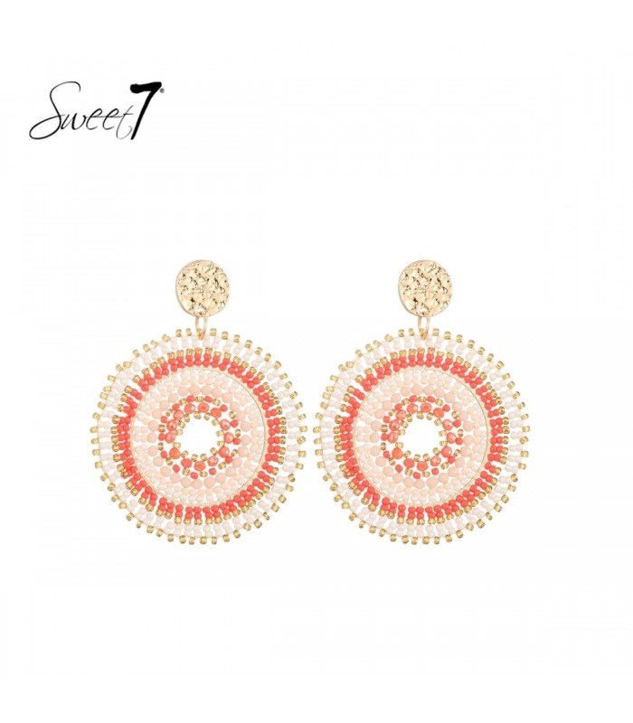 Oorbellen met een opvallend rond design, versierd met fijne kralen in warme tinten. De goudkleurige accenten geven een luxe uitstraling, terwijl het bohemian patroon zorgt voor een speelse touch. Deze oorbellen zijn een perfecte mix van elegantie en trendy fashion.