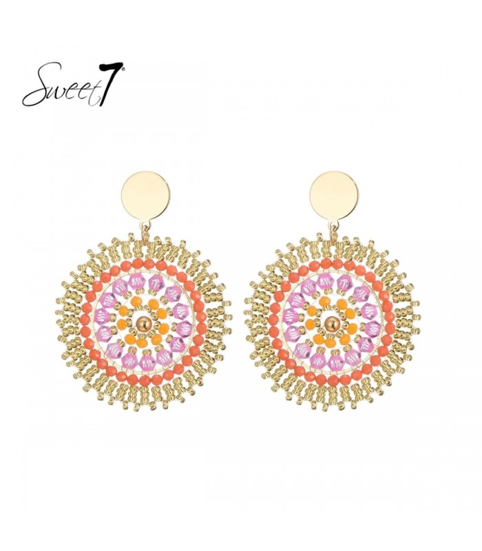 Draag je de zon in je oren? Deze kleurrijke oorbellen van Sweet7 vangen het gevoel van een zwoele zomeravond in een ontwerp. Met een cirkelvormig patroon vol koraal roze, zonnig geel en sprankelend lila straalt elke oorbel als een kleine zon. Perfect voor wie houdt van statement sieraden met een boho touch en kleur.