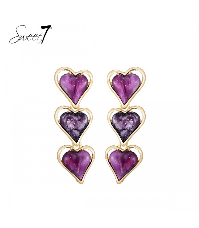 Hoe laat je kleur spreken in je outfit? Deze oorbellen met drie opvallende hartvormen in paars en lila zorgen voor een krachtige, maar elegante uitstraling. De harten zijn omlijst met een goudkleurige rand die zorgt voor extra contrast en luxe. Ideaal voor wie houdt van statement sieraden. Oorbellen met opvallende kleurmix Dankzij het marmer effect in het middelste hart ontstaat er een speels en uniek patroon. Deze oorbellen passen perfect bij trends als paarse oorbellen en statement oorbellen dames. Combineer ze met een eenvoudige top of juist met een feestjurk voor extra flair.
