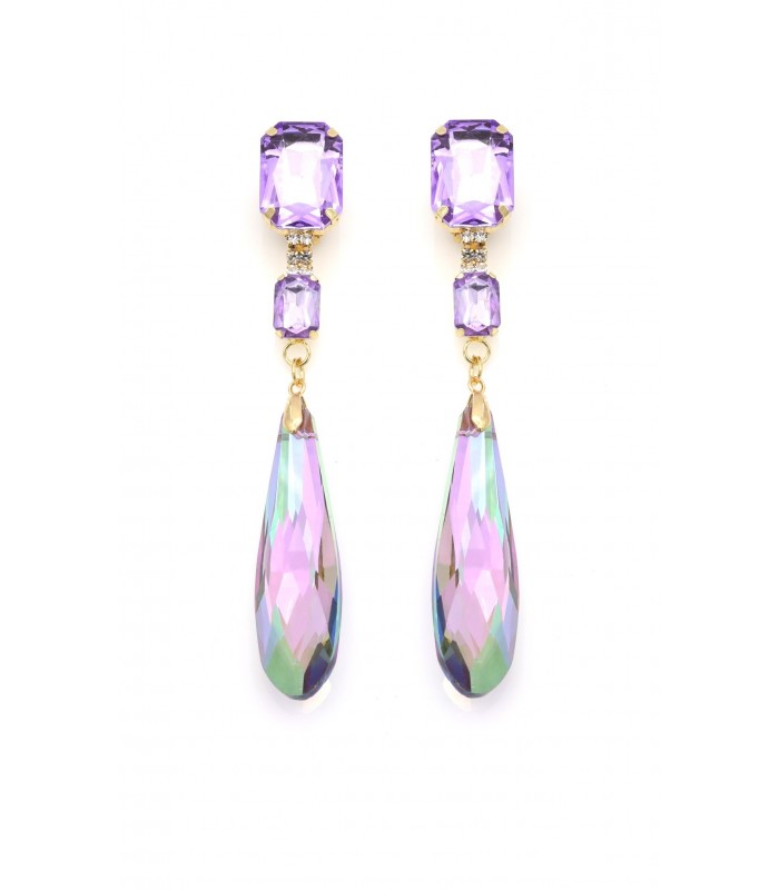 Oorclips met betoverende glans. Oorclips die elke beweging laten schitteren? Deze clip oorbellen combineren lila kristallen met fonkelende strass en een lange regenboog druppel. Het licht breekt in zachte pastelkleuren. Perfect als statement oorbellen voor een feest of avondlook.