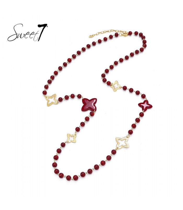 Zoek je een ketting die direct opvalt? Deze rode halsketting met goudkleurige accenten en speelse bloemvormen biedt een eigentijdse en stijlvolle uitstraling. De combinatie van glanzende kralen en open metalen vormen maakt dit een sterk mode statement.