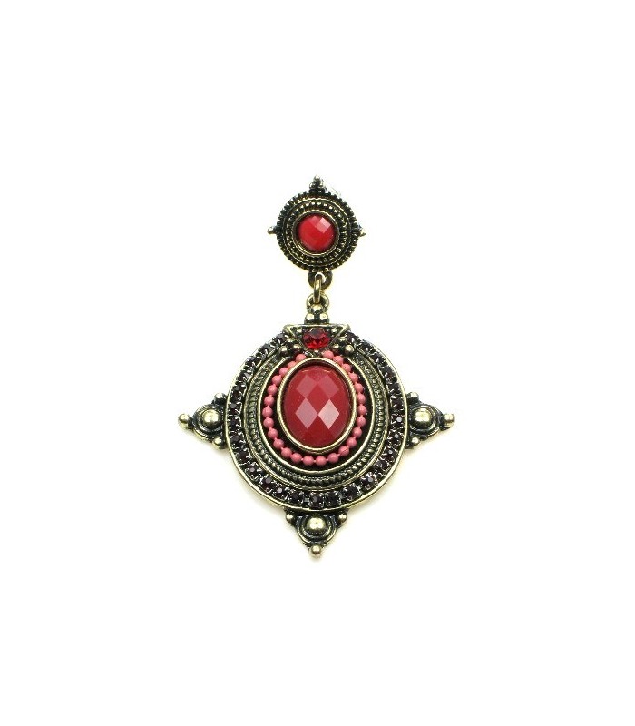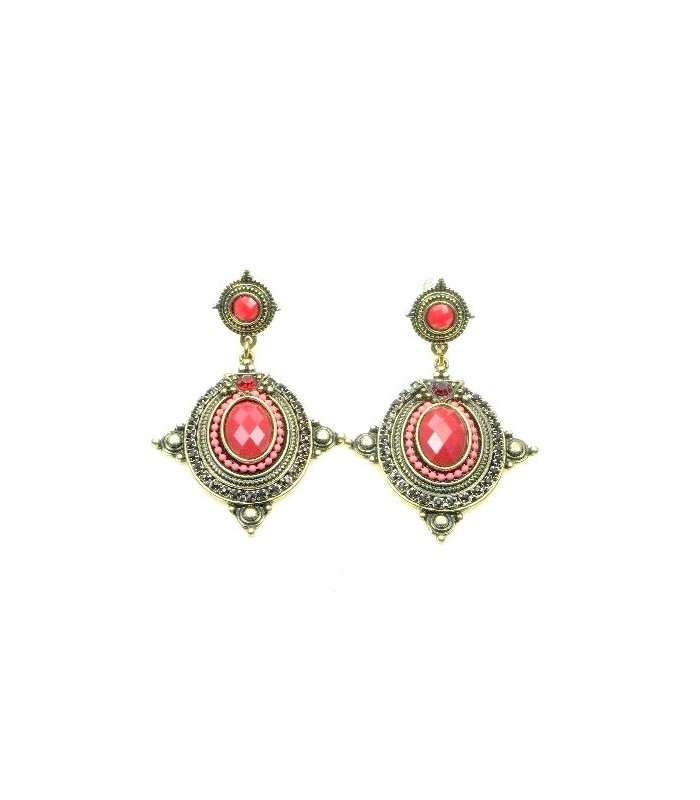Goudkleurige oorhangers met rode steen en roze kralen.