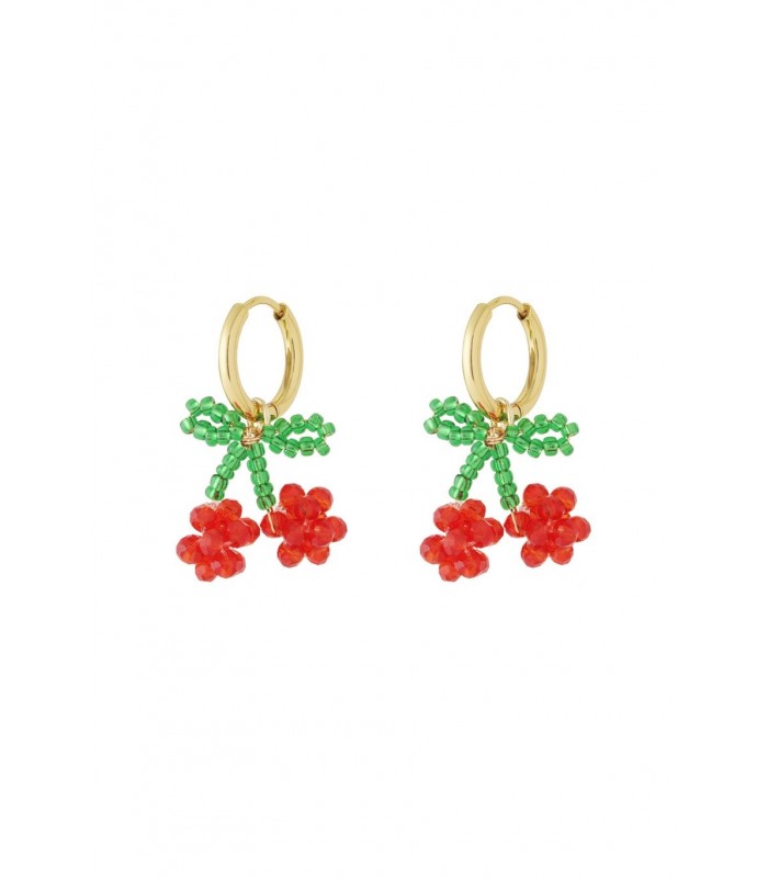 Wil je een frisse, vrolijke touch aan je outfit toevoegen? Deze oorbel met kersvormige hanger van rode en groene kralen brengt instant zomergevoel en een speelse uitstraling. Goudkleurige basis. De subtiele goudkleurige ring maakt deze oorbellen stijlvol en makkelijk te combineren. Perfect bij casual looks, festivaloutfits of een zomerse avond.