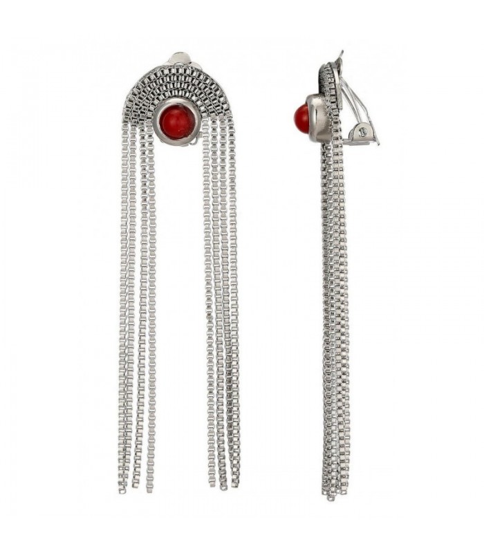 Oorclips met opvallende rode kraal en zilverkleur strengen.