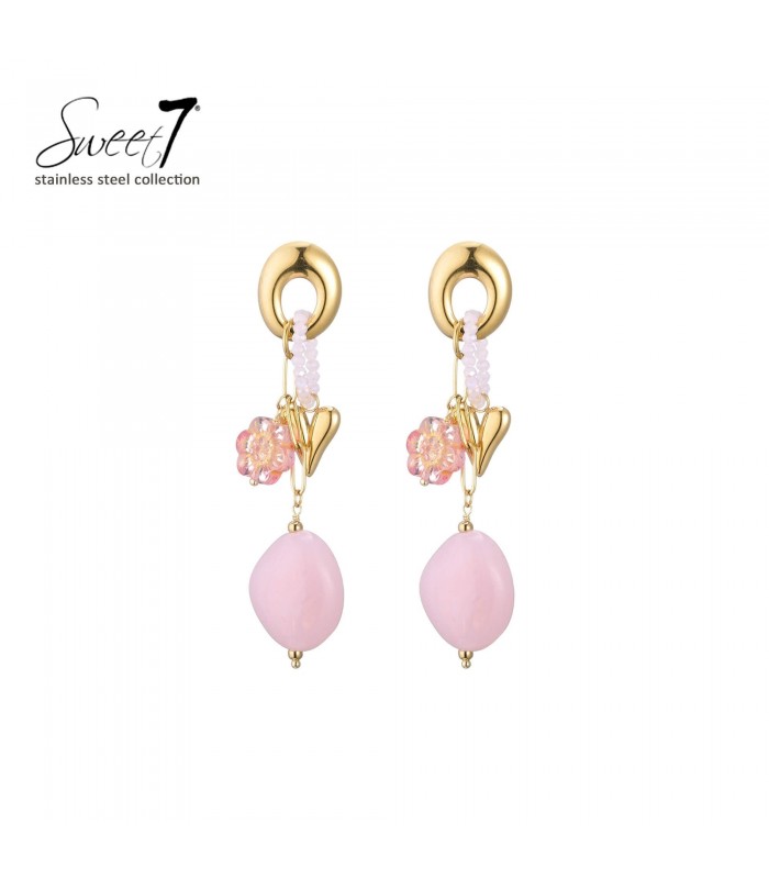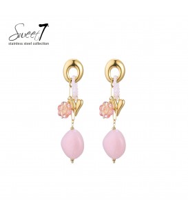Oorbellen met romantische touch. Droom je van een oorbel die zachtheid en glamour combineert? Deze oorbellen stralen pure finesse uit. De goudkleurige oorbel is verrijkt met een hartje, een subtiele bloem en een roze kraal. Perfect als stainless steel oorbellen voor een trendy look.