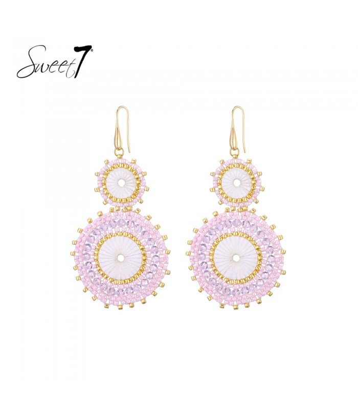 Oorbellen met roze kralen en cirkels. Met deze oorbel en oorbellen vol roze kralen en verfijnde cirkels. De combinatie van goudkleur en zachte tinten maakt dit een echte eyecatcher binnen trendy sieraden en statement oorbellen.