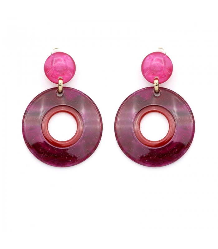 Hoe breng je kleur en vorm samen in een krachtig sieraad? Deze oorclips combineren een diepe fuchsiatint met een uitgesneden cirkelvorm voor een opvallend grafisch effect. De glanzende afwerking en subtiele glitterdeeltjes zorgen voor extra dimensie.