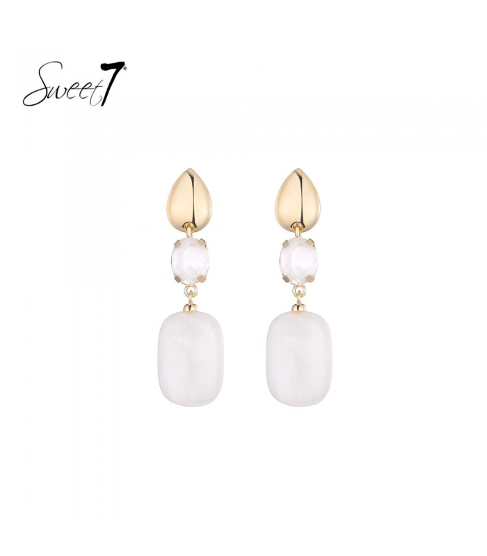 Deze oorbellen van Sweet7 combineren zachte witte stenen met een glanzend goudkleurige basis. De vorm is verfijnd, de uitstraling puur. Ze vangen het licht op elke beweging en zorgen voor een serene, stijlvolle look, of je nu op een event bent of gewoon jezelf wilt zijn met een vleugje klasse.